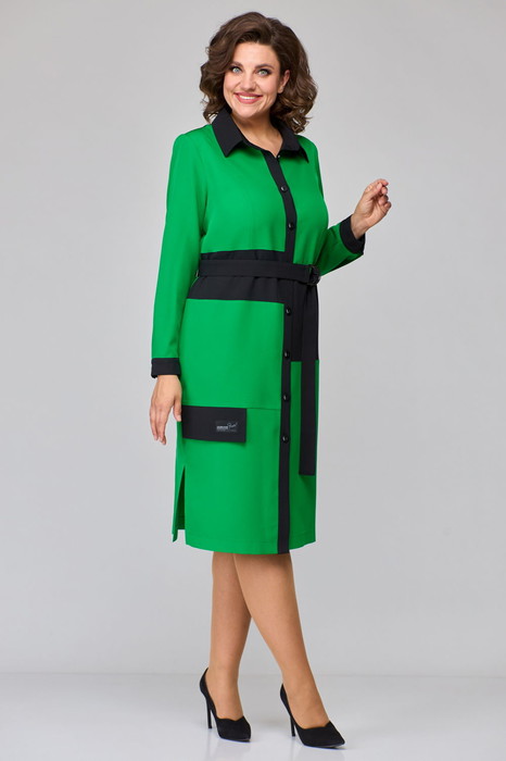 Платье женское, изготовлено путем комбинации тканей разных цветов. Перед с нагрудными вытачками. Воротник рубашечного типа, застежка — центральная планка на петли и пуговицы. Спинка с кокеткой и рельефами. В боковых швах обработаны карманы и разрезы. Рукав втачной, длинный с манжетой. Платье дополнено съемным поясом с пряжкой.