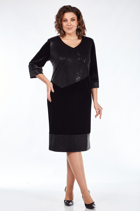 Платье женское, прямого силуэта, слегка зауженное к низу. Изготовлено из велюра и отделочной ткани с пайетками. Горловина фигурной формы.  По переду обработаны нагрудные вытачки. Платье отрезное по талии. По лифу платья, низу изделия и низу рукавов — отделочная ткань. По спинке средний шов и разрез внизу. Рукава втачные, длиной 3/4.