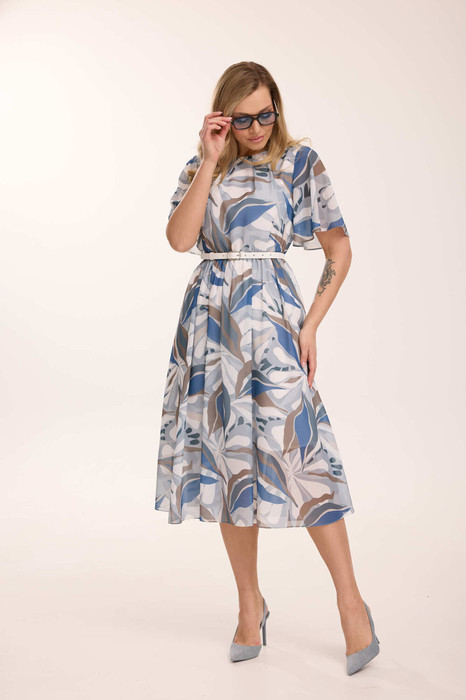 Платье женское, на подкладке, отрезное по линии талии. Перед лифа цельнокроеный, со сладками в области горловины. По лифу спинки обработан разрез с застежкой на навесную петлю и пуговицу. Горловина округлой формы. Рукав расклешенный, длиной до локтя. Юбка полусолнце. Пояс присборен на резинку. Платье комплектуется съемным ремнем. Декоративные элементы и фурнитура могут отличаться от заявленных на фото. Цвет материала может отличаться по тону в зависимости от настроек вашего монитора!