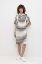 Платье женское полуприлегающего силуэта, отрезное по линии талии. Лиф платья кроя «летучая мышь». Перед лифа цельнокроеный. Спинка лифа цельнокроеная. Горловина лодочкообразной формы. В области плечевых швов застрочены защипы для формирования складок по переду. Низ рукавов обработан притачной манжетой из ткани-компаньона. Перед юбки с декоративными подрезами и имитацией прорезных карманов с листочкой из ткани-компаньона, обработан разрез. Заднее полотнище юбки цельнокроеное.