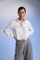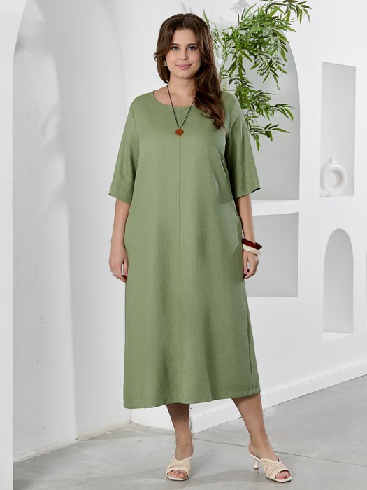 Платье женское из гладкокрашеного тканого полотна, свободное,слегка расширенное к низу, с горловиной овальной формы, короткими втачными рукавами, вытачками в области груди, карманами в боковых швах. Перед состоит из двух частей, в шве соединения деталей по центру разрез, горловина окантована основным материалом.