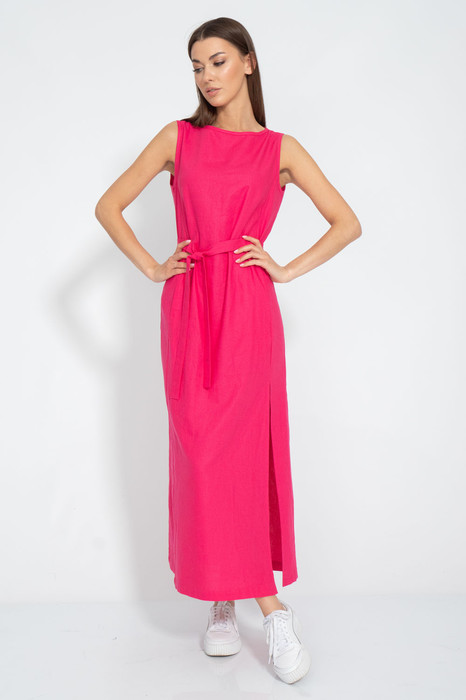 Платье удлиненное с боковым разрезом, из льна с вискозой - это стильное и комфортное платье для жаркого лета. Платье имеет прямой силуэт, с карманами в рельефах по переду. Платье декорировано боковым разрезом, который придает ему легкость и изящество. Лен с вискозой - это натуральная ткань, которая хорошо дышит, приятна к телу. Платье  можно сочетать с различными аксессуарами и обувью, создавая элегантные и романтические образы. Рост 164-170