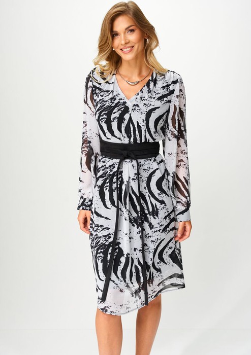 Платье женское, повседневное, на подкладке,свободного силуэта, расширенное книзу, длиной ниже коленей, с втачными рукавами, со съемным поясом. Вырез горловины детали переда платья «V-образной» формы, по центру обработана складка. По плечевым швам обработана сборка. Рукава втачные одношовные, с притачными манжетами, с застежкой на 2 петли и 2 пуговицы. Разрезы обработаны окантовкой, по швам притачивания обработана сборка. Платье: длина рукава - 61см, ширина рукава – 21см, длина спинки – 107см.