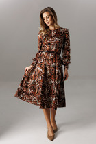 Платье женское из перфорированного хлопка, свободного силуэта, на подкладке,расширенное книзу, длиной ниже коленей,с втачной стойкой по горловине, отрезное на уровне линии талии, со съемным поясом. Лиф деталей переда платья с застежкой на 4 петли и 4 пуговицы, с «V-образным» вырезом, с нагрудными вытачками, исходящие от линии талии, с притачными планками. В шов притачивания планок вставлена декоративная тесьма. Юбка платья конической формы, с горизонтальным подрезом фигурной формы, по швам соединения обработана сборка. Рукава втачные одношовные, короткие, со сборкой по шву втачивания, низ рукавов декорирован отделочной тесьмой. По горловине втачная стойка с «рюшей». Длина рукава – 12см, ширина рукава – 33см, длина спинки – 98см.
