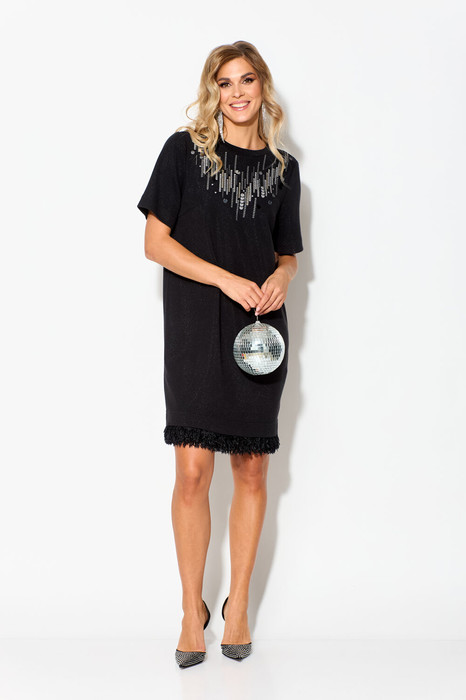 Платье женское, полуприлегающего силуэта, с втачными рукавами, длиной до коленей. Деталь переда платья с нагрудными вытачками, вверху расположена аппликация-печать и прикреплены «пайетки с бусинами». Деталь спинки платья со средним швом, который заканчивается разрезом. Рукава втачные одношовные, короткие. Вырез горловины платья округлой формы, с втачной бейкой. По низу платья съемный элемент из отделочной ткани, который застегивается на 15 петель и 15 пуговиц.