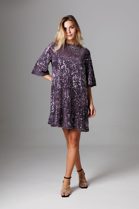 Элегантное платье А-силуэта из мягкого трикотажного полотна велюр с пайетками и текстильными лентами на спинке, которые завязываются в эффектный бант.
