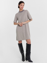 Элегантное платье нежного нюдового тона А-силуэта из текстильной фактурной ткани с деликатным коротким ворсом, рукавом-реглан укороченной длины (41 см). Спинка изделия имеет средний шов, в котором расположена потайная застежка- молния, а также на деталях расположены вертикальные талиевые выточки. Горловина платья оформлена стойкой-воронкой, высотой 4 см.