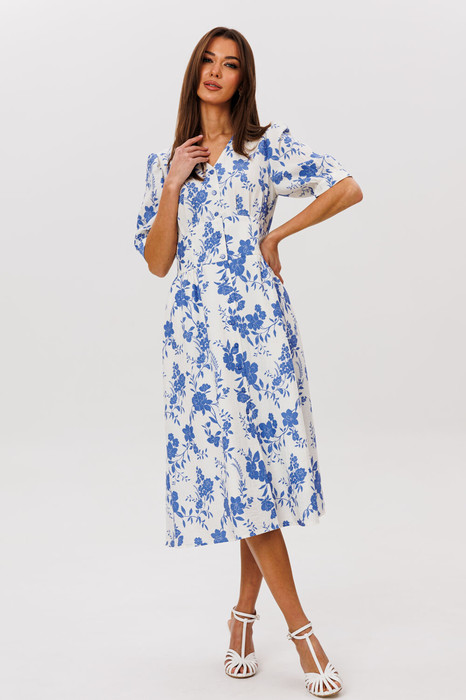 Воздушное изящное летнее платье. Изделие состоит из отрезного лифа и спинки. Спереди лифа расположены складки на обьем по линии груди, по спинке модельная сборка. Лиф и юбку соединяют облегающие рельефные детали, имитирующие фигурный корсет, высотой от 7,5-12 см. Горловина имеет V-образный вырез. Рукав укороченной длины 30 см на свободной манжете. По окату и низу рукава: сборка. Юбка изделия на спокойной сборке по линии талии, к низу детали юбки имеют расклешение. Также юбка платья имеет подкладочную юбку укороченной длины, которая притачивается совместно с основной к деталям пояса платья. Спереди платье имеет застежку на петли-пуговицы. Длина платья по спинке 112-115 см (в зависимости от размерного ряда).