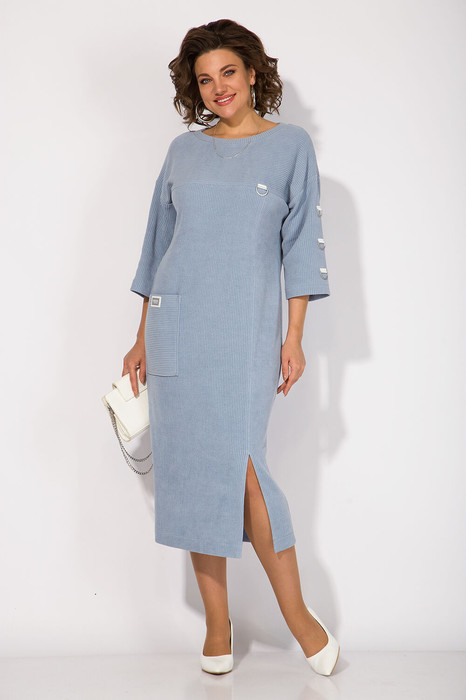 Эффектное платье выполнено из   трикотажного штрукса, создано для тех, кто ценит комфорт в повседневной жизни. Модель полуприталенного силуэта со спущенной линией плеча. Рукав длиной3/4-ти украшает ряд декоративных полуколец.  Вырез горловины округлый, на мягкой планке.  Полочка с отрезной кокеткой и ассиметричным рельефом, переходящим в разрез на свободу движения. Ассиметричный накладной карман украшает декоративная нашивка.