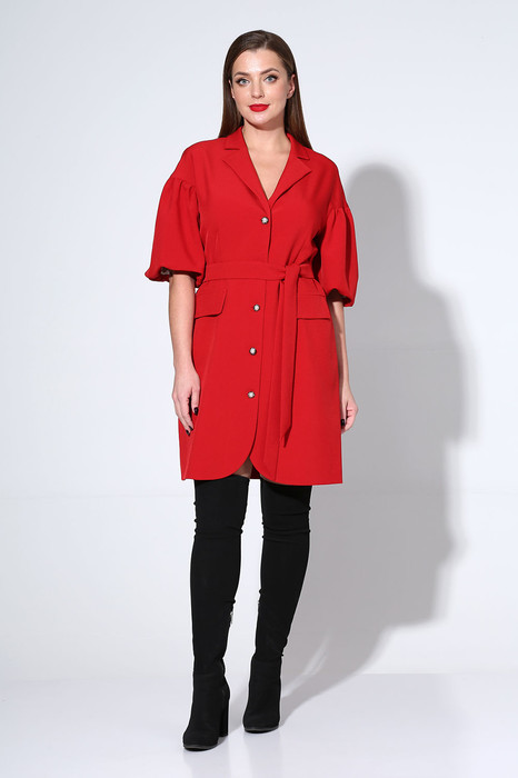 Платье приталенного силуэта, со спущенной линией плеча и объёмными рукавами со сборкой. Центральная бортовая застёжка на петли и пуговицы. Воротник пиджачного типа с отложными лацканами. По переду платья расположены талиевые вытачки и декоративные клапаны. По спинке платья талиевые вытачки. Имеется съёмный пояс из основной ткани.