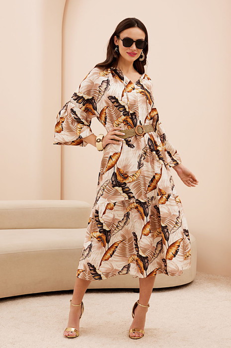 Эффектное платье в стиле «Бохо» из очень приятной  принтованной  ткани  дополнено готовым поясом , отлично подходит для шпилек и обуви на плоском ходу.  Платье А образного силуэта  с притачным воланом отрезное по линии талии (на резинке).  Лиф со средним швом и округлым вырезом на завязках с фиксаторами, Рукав комбинированного покроя, линия плеча приспущена, нижняя часть  со складками и резинкой по низу (можно регулировать длину рукава).  Съемный пояс  фабричного производства  завершает весь образ.