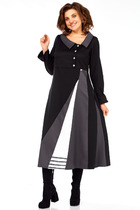 Платье  с округлым вырезом ближе к лодке,  вырез оформлен отрезной обтачкой с каплей и настрочной планкой, обтачка с застежкой на пуговицу.  Перед  отрезной ниже линии талии, лиф оформлен вертикальными застроченными вытачками от плеча, низ со средним швом и фигурной линией.  Спинка удлиненная со средним швом и талиевыми вытачками, застежка на потайную молнию в среднем шве. Рукав втачной.