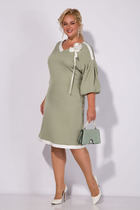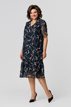 Платье с округлым вырезом горловины, отрезное по талии и съёмным поясом из ткани. Перед с кокеткой из сетки горохи флок и дизайнерским вырезом в верхней части. Нижняя часть переда со встречной складкой. Спинка с талиевыми вытачками и потайной молнией в среднем шве. Рукава втачные выполненные из сетки горохи флок. Изделие с карманами в боковых швах.