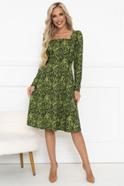 Платье с фигурным вырезом горловины по переду и стойкой по спинке. По талии съёмный пояс из основной ткани. Изделие со складками от кокетки по переду и спинке. Перед с декоративными пуговицами в верхней части и средним швом. Спинка с разрезом в среднем шве. Рукава втачные, со сборкой по окату и складкой с пуговицами в нижней части.