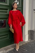 Платье с округлым вырезом горловины, отрезное ниже линии талии и сборкой от неё. Перед с двумя рельефами от горловины до боковых швов и карманами в них. Спинка с потайной молнией в среднем шве и талиевыми вытачками до отрезной детали ниже линии талии. По низу платья идёт волан со сборкой. Рукава втачные. Изделие на подкладке.