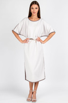 Платье с V- образным вырезом горловины, съёмным поясом по талии и фигурным низом. Спинка с талиевыми вытачками. Рукава втачные, с узкой резинкой по низу. Изделие на подкладке.