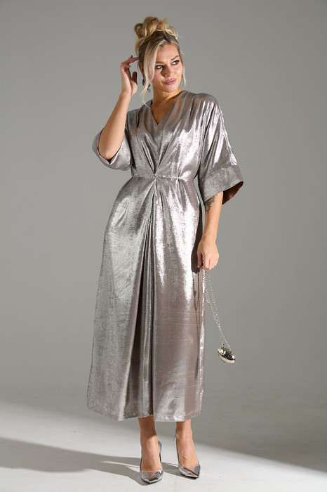 Платье большого объёма с цельнокроеными рукавами. По переду расположены 2 тесьмы из основной ткани, который завязываются на запах, что позволяет регулировать обхват талии.