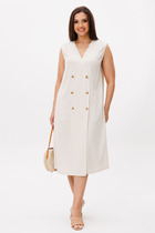Платье свободного объёма прямого силуэта из плотной джинсовой ткани. Длина платья ниже колена, по бокам разрезы. Горловина V-образная, воротник платья рубашечного типа. В комплекте к платью идёт пояс.