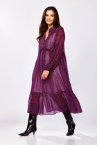 Платье из лёгкой ткани с ярким принтом. Застежка на потайную молнию по среднему шву спинки. В комплекте идет длинный съемный пояс. На юбке по линии талии заложены складки. Длина 128 см.