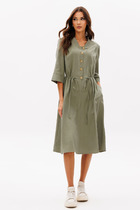 Платье прямого силуэта, длиной ниже колена,со спущенной линией плеча и рукавами на основе цельнокроеного. Спинка и перед с горизонтальной кокеткой.Застежка спереди на планку и петли-пуговицы. Воротник рубашечный на стойке. По линии бёдер диагональный подрез. По переду нижней части платья глубокая складка. Пояс в комплекте.