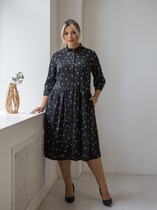 Платье классического кроя на подкладке. Рукав втачной длинный. Округлый вырез горловины, по переду вертикальные рельефы из проймы и талевые вытачки, по бокам накладные карманы вышиты в стиле «Ришелье». По спинке средний шов, переходящий в застежку на потайную молнию и талевые вытачки.