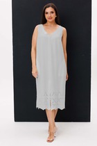 Платье на бретелях полуприлегающего силуэта из ришелье. По переду и спинке притачной пояс. На лифе переда нагрудные вытачки, на спинке – талиевые. Нижняя часть платья со сборкой по линии притачивания с поясом. В боковом шве потайная молния.