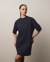 Стильное платье свободного кроя со слегка завышенной фигурной линией талии по переду. Рукав втачной, длиной ниже локтя. По спинке застежка на потайную молнию. Платье дополнено функциональными боковыми карманами.  Длина платья от плечевого шва 126 см. Длина рукава 38см.