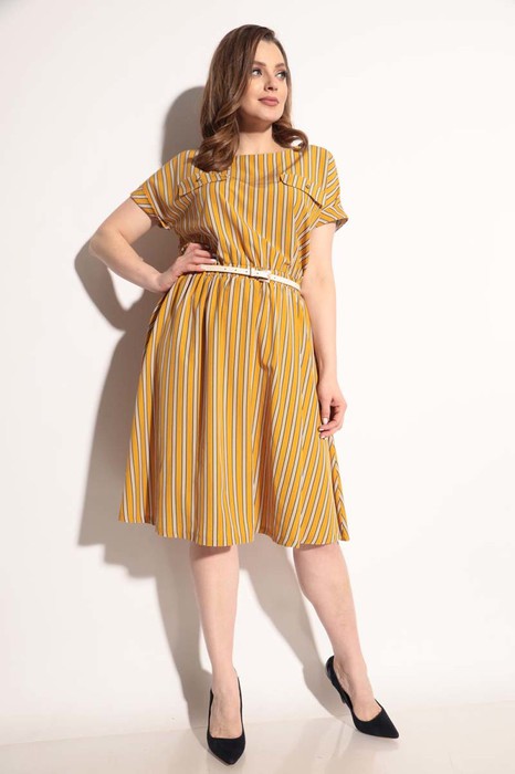 Струящееся платье с расклешенной к низу юбкой, выполнено из облегченной ткани очень приятной к телу, в боковых швах карманы. Рукав цельнокроеный приспущенный на отложенной манжете. Настрочные клапаны по лифу платья имитируют вход в карман и украшают, но абсолютно не утяжеляют изделие. По поясу вставлена резинка, фиксирующая высоту талии и подчеркивающая ее. Ремешок идет в комплекте. Длина по спинке 109+-1см.