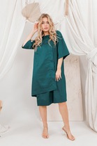 Нарядное платье свободного силуэта выполнено из плиссированной ткани, поставлено на трикотажную подкладку. На полочке обработана отрезная кокетка, остальные воланы отлетные, края заработаны флешем. Рукав втачной, до локтя, слегка расклешен. Спинка идентична полочке, горловина окантована. Платье декорирована цветком. В этом платье прекрасно скрываются все недостатки фигуры, а благодаря легкости ткани ваш образ будет воздушным и нежным!