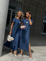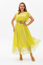 Летнее платье полуприлегающего силуэта, со слегка расширенной к низу юбкой выполнено из хлопковой ткани и кружева. Платье отрезное по линии талии, с мягким поясом, завязывающимся на бант. Платье с рельефами по лифу и с центральной застежкой на навесные петли и пуговицы. Центральная часть платья по лифу из кружева поверх основной ткани. Платье с карманами и декоративными защипами по юбке. Юбка платья с нижним воланом из кружева на просвет. Шов притачивания волана декорирован настроченной тесьмой. Рукав платья втачной, короткий, слегка расширен к низу, с защипами по центральной части. Низ рукава декорирован притачной тесьмой.