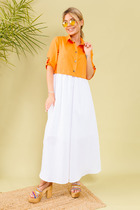 Легкое, летнее платье, полу- прилегающего силуэта, выполнено из  штапеля в полоску, однотона и сетки с цветами. Горловина платья округлой формы, окантована, лиф платья с фигурными подрезами, по горловине вставка из сетки с цветами, по бокам штапель в полоску. Спинка выполнена из однотонного штапеля, со средним швом и вытачками, рукав втачной, выполнен из сетки, по низу окантован штапелем в полоску.