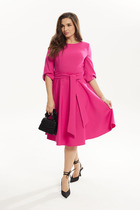 Эффектное женское платье, полу-прилегающего силуэта, выполнено из плиссированной ткани, на трикотажной подкладке. Лиф платья отрезной по линии талии, горловина округлой формы, на обтачке, также на горловине обработаны втачные планки из атласа в тон и декорированы стразами. По линии горловины выполнена вставка из сетки, что придает платье еще больше эффектности, по линии талии втачной пояс из основной ткани, декорирован стразами. Юбка присборена по линии талии и расклешена к низу, спинка отрезная по линии талии, со средним швом и вытачками. Рукав втачной, выполнен з основной ткани, укороченный. Стильное платье, то, что надо для торжественного мероприятия!