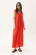 Нарядное женское платье полу-прилегающего силуэта, выполнено из плиссированной ткани, на трикотажной подкладке. Горловина V-образной формы, на обтачке, лиф платья отрезной по линии талии, с втачным поясом из основной ткани, декорирован съемным цветком. Юбка А-образного силуэта, на юбке выполнен вертикальный подрез, с разрезом по низу и вставками воланов из основной ткани. Спинка со средним швом и вытачками, рукав втачной, оптимальной длины, выполнен из основной ткани. Эффектное платье из нежной и эффектной ткани прекрасно подойдет для любого мероприятия.