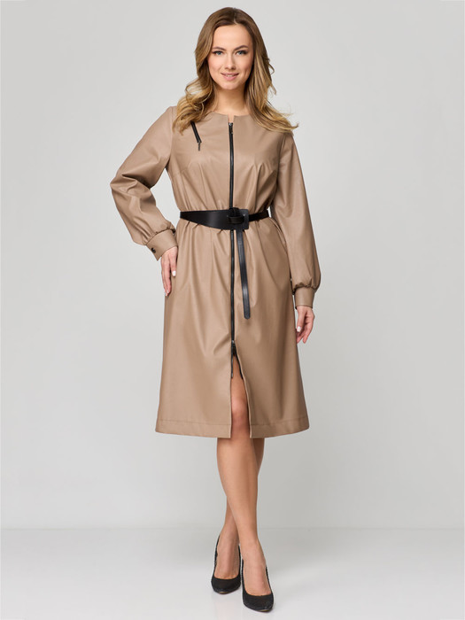 Платье из ЭКО-кожи на хлопковой основе. По переду застежка молния  и декоративная молния выходящая из плеча. В боковых швах карманы. Рукав втачной одношовный со сборкой и манжетой по низу. Манжета застегивается на метлю и пуговацу. Длина платья  104 см, длина рукава 60 см.