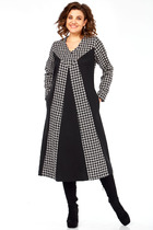 Платье женское  А- силуэта. Рукав втачной, двухшовный. По переду отлетная деталь имитирующая «косуху», с декоративной, не функциональной застежкой – молнией. Горловина округлой формы, воротник апаш из отделочной ткани. По линии талии подрез. Нижняя часть платья  со сборкой, на подкладке. Выполнена из отделочной ткани с отстрочными швами, накладным карманом с клапаном на две петли и пуговицы. Карман функциональный. Спинка со средним швом, отрезная по линии талии, со сборкой из отделочной ткани. В верхней части спинки потайная молния. Длина изделия по спинке 115см. Длина рукава 52см.