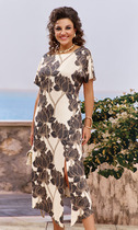 Платье свободного покроя с асимметричными горизонтальными подрезами и кокеткой. Кокетка декорирована печатью и нашивным элементом. Спинка с кокеткой. Рукав втачной одношовный короткий. Длина платья 115 см, длина рукава 22 см. Декоративная нашивка может отлечаться от фото.