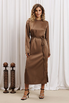 Платье прямого силуэта выполнено из атласа. Округлый вырез горловины. С левой стороны имеется разрез. Рукав цельнокроеный с отложной манжетой. Спинка со средним швом. Имеется съемный пояс. Длина по спинке-120 см, длина рукава –22 см.