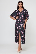 Платье женское отрезное выше линии талии, свободное.  Центральная часть спинки стянута на резинку «венгерку». Горловина фигурная, регулируется завязками. Окаты рукавов стянуты на тонкую резинку. Рукава одношовные втачные, на уровне локтевого сгиба рукав стянут резинкой «венгеркой». Платье без подкладки.