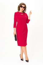 Платье женское свободного силуэта отрезное ниже линии талии, выполнено из плательной ткани. Перёд платья с фигурными кокетками и центральным швом.  Спинка со средним швом и застёжкой на потайную молнию. Горловина V-образная. Рукава одно шовные втачные со сборкой по низу.  Платье без подкладки. Украшением платья служат рюши и декоративные пуговицы.
