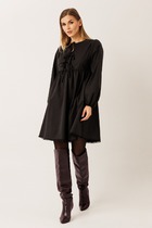 Женское платье – рубашка свободного силуэта выполнено из хлопко содержащей ткани. По переду нагрудные вытачки, потайная застёжка на прорезные петли и пуговицы, декоративная печать. По спинке кокетка и две небольшие складки. Воротник отложной на стойке. Рукава одношовные втачные на манжете. Горизонтальный подрез по низу платья и низ платья обработан контрастным кантом. В боковых швах функциональные карманы. Платье без подкладки. Дополнением служит пояс.