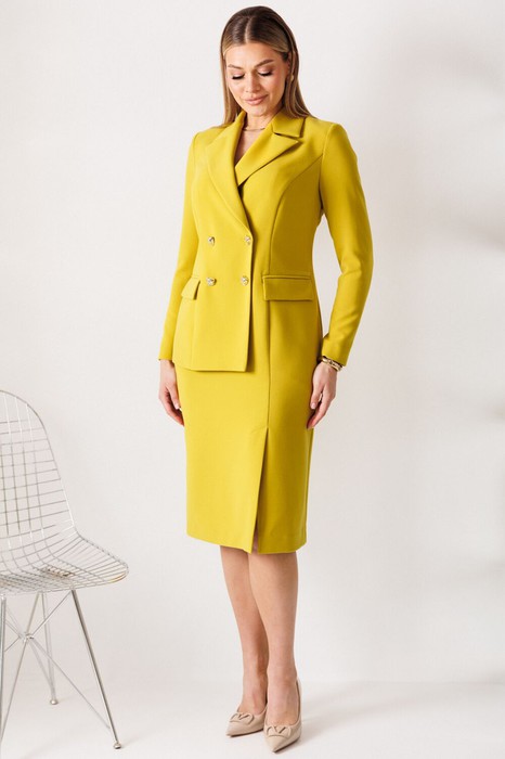 Сомневаетесь, выбрать для важной встречи строгий костюм или элегантное платье? Предлагаем блестящий компромисс! Платье-блейзер полуприлегающего силуэта, длиной ниже колена.Имитация жакета придаёт деловой стиль. Воротник пиджачного типа. Застёжка двубортная на 2 пары пуговиц,в левом боковом шве- потайная молния. На полочке присутствует рельеф из проймы до низа,в котором обработана шлица, обработаны карманы «в рамку с клапаном».Спинка со средним швом и талевыми вытачками. Рукава длинные, двушовные. Платье частично на подкладке. Вы получаете весь эффект от сложного ансамбля, минуя лишние сложности. Платье подчеркивает Ваш статус и деловой настрой.