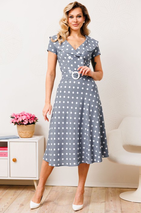 Элегантное и женственное платье приталенного силуэта, отрезное по талии, расширенное к низу, со смещенной застежкой на 4 пуговицы. По переду талиевые и нагрудные вытачки. Спинка со средним швом и талиевыми вытачками. Воротник отрезной, шалевый. Рукав втачной, одношовный. Застежка-молния в боковом шве. Платье дополнено широким поясом с декоративной пряжкой.