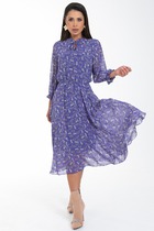 Нарядное женское платье прямого силуэта, выполненное из плательной шифоновой ткани (не тянется), на трикотажной подкладке (тянется). Платье отрезное по линии талии. По лифу переда центральная застежка на петли-пуговицы. Горловина округлой формы, обработана окантовкой, переходящей в завязки. В горизонтальный подрез по переду вставлен волан. Нижняя часть платья присборена по линии подреза. По низу платья – настрочной широкий волан. Рукава втачные, одношовные. Низ рукава собран резинкой, по центру рукава декоративная завязка-бантик.