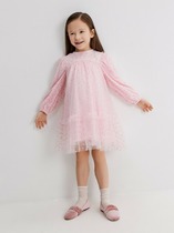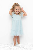 Платье нарядное для девочки полуприлегающего силуэта с втачными короткими рукавами. Платье отрезное по линии талии, полочка и рукава выполнены из ткани с пайетками, юбка пышная с 2-мя слоями сетчатого фатина на подкладке, верхний слой юбки декорирован по