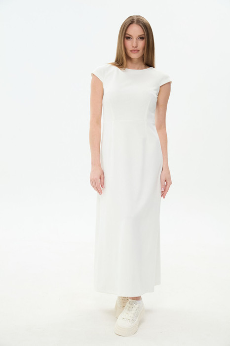 Платье длиной миди отрезное по линии талии приталенного силуэта. Нижняя часть платья имеет небольшое расклешение.Прилегание по переду создано за счет нагрудных вытачек, переведенных в боковой шов, и талиевых вытачек. На спинке талиевые вытачки и средний шов. Застежка платья на потайную молнию в среднем шве спинки. Плечевой пояс оформлен кокетками по переду и спинке, напоминающими по форме рукав реглан. Плечо немного приспущено.