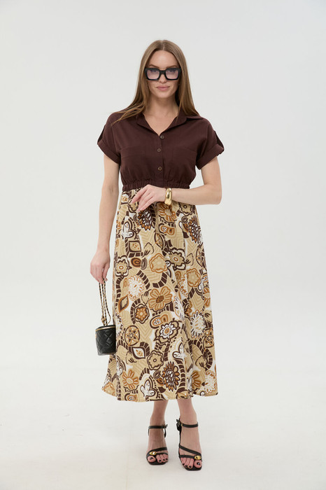 Платье умеренного объема прилегающего силуэта, отрезное, на резинке по линии талии. Застежка лифа полочки притачная планка на прорезные петли и пуговицы. На полочке расположены накладные нагрудные карманы. Воротник на отрезной стойке с отложным воротником. Рукав цельнокроеный, короткий, с притачной манжетой, которая фиксируется патами на пуговицу.
