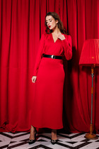 Роскошное платье приталенного силуэта, слегка  расширенное к низу. Отрезное по линии талии. На деталях переда и спинки отрезные кокетки. На детали переда средний шов. По верхнему краю и на участке талиевого шва деталей переда и спинки выполнена сборка. Вырез горловины V-образной формы. На детали нижней части переда и спинки талиевые вытачки. Рукав длинный, втачной. Застежка платья на потайную молнию в боковом шве. В комплект к изделию идёт ремень, может отличаться от фото.