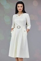 Женственное платье из замшевой ткани длиной миди свободного прямого кроя с горловиной, обработанной обтачкой. Рукава втачные длиной три четверти. Застежка центральная на петли и пуговицы. Накладные карманы. По боковым швам - разрезы. Изделие без подкладки.