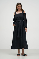 Платье миди полуприлегающего силуэта отрезное по линии талии с расклешенной юбкой. Перед и спинка со средним и рельефными швами. Горловина округлой формы. Крой рукава с верхним и нижним швами. Притачная манжета заужена к низу. В комплекте входит пояс из основной ткани.