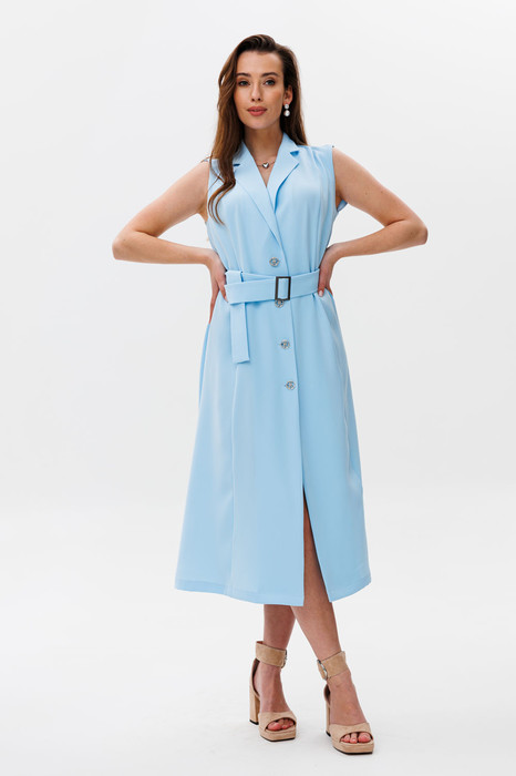 Многофункциональное платье-жилет макси полуприлегающей силуэтной формы без рукавов. Полочка со смещённым бортовым краем назапах, с рельефными швами от линии плеча до низа. Застежка на петли и пуговицы. Спинка со средним швом и талиевыми вытачками. Воротник отложной с отрезной стойкой. В комплект входит пояс из основной ткани с отделочной пряжкой. Идеально комплектуется с брюками в качестве удлиненного жилета.